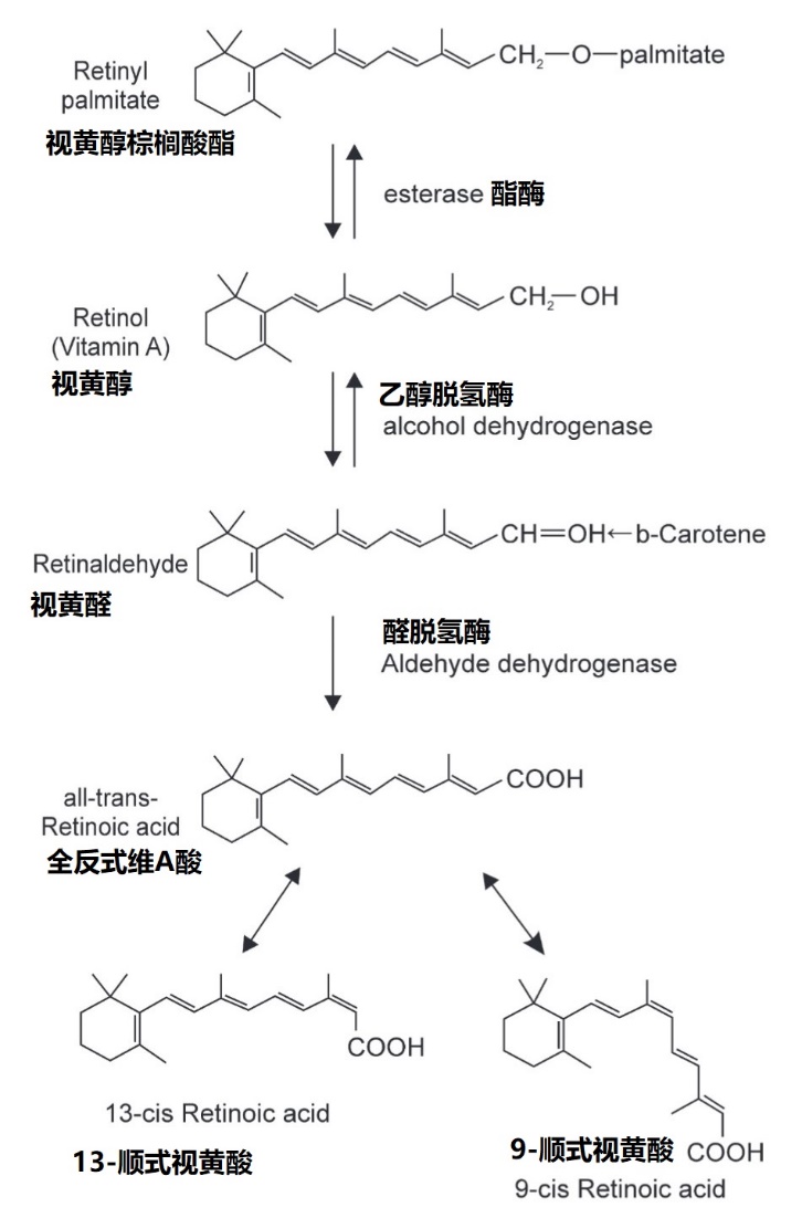 維A酸以降,維生(shēng)素A家(jiā)族的(de)主要(yào)成員(yuán)的(de)皮膚功效依次為(wèi)視(shì)黃(huánφg)醛、視(shì)黃(huáng)醇、視(shì)黃(huáng)酯(如(rú)視(shì)黃(huáng)醇棕榈酸酯)。它們間(jiān)的(de)酶轉化(huà)如(rú)下(xià):