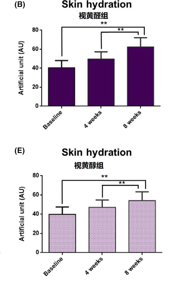 保濕度用(yòng)Corneometer CM 825測量,結果兩組均有(yǒu)增加,其中視(shì)黃(huáng)醇半臉8周後增加35.78%,視(shì)黃(huáng)醛半臉增加53.97%,差距有(yǒu×)統計(jì)學意義(p <0.001):