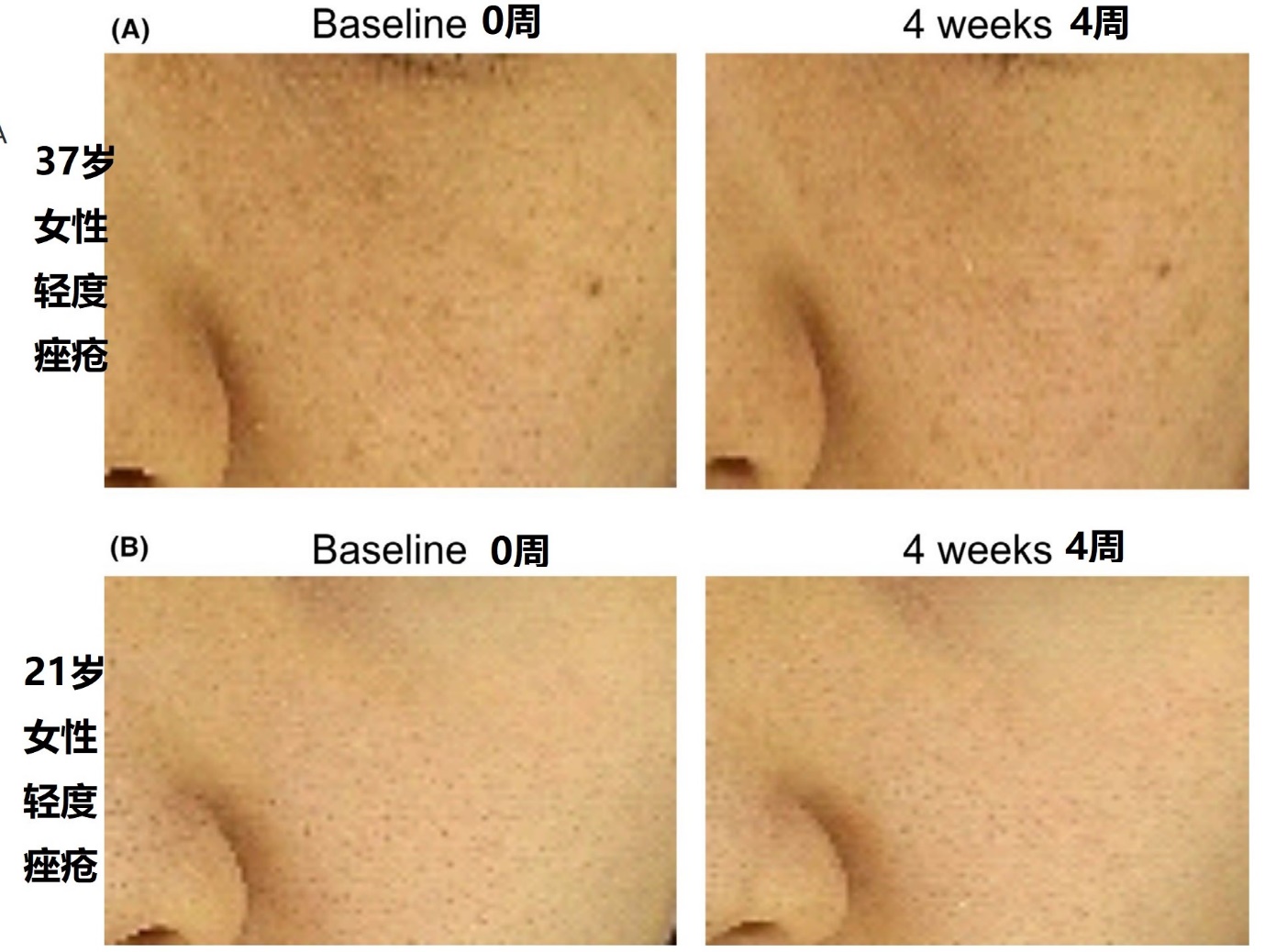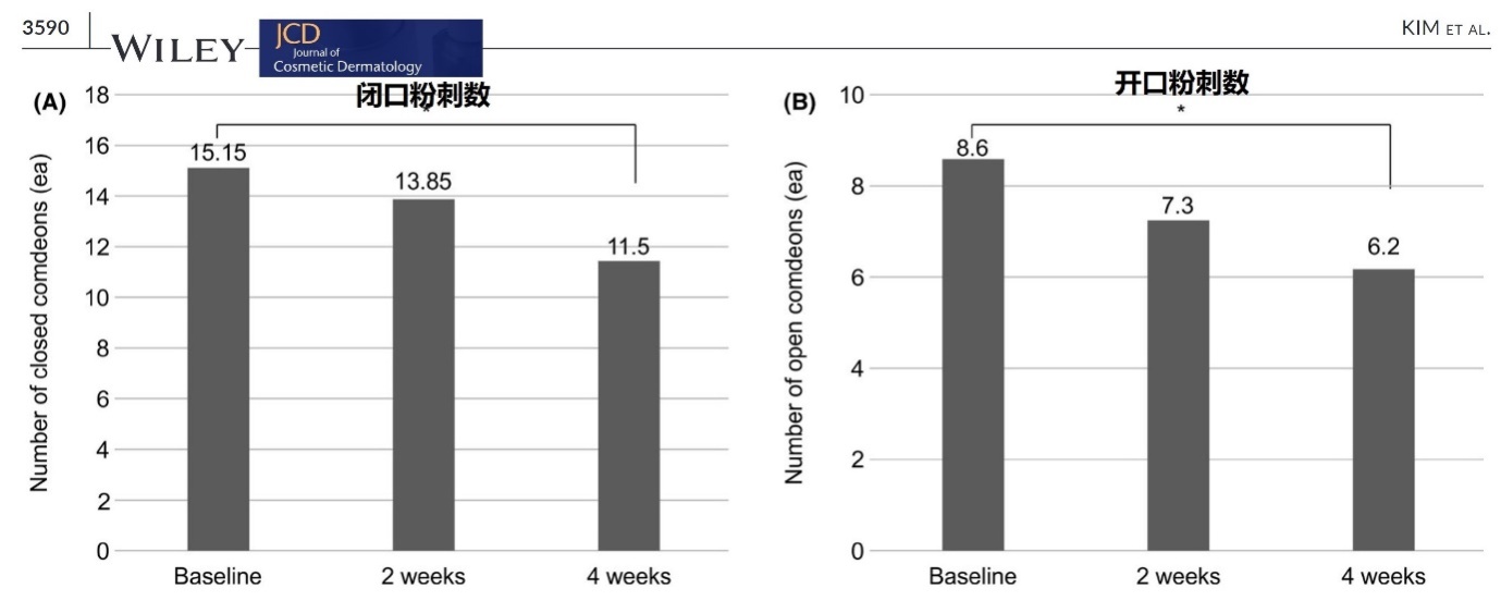 受試者的(de)粉刺數(shù)由研究員(yuán)肉眼計(jì)算(suàn)。4周後閉口粉刺減少(shǎo)24.01%(p < 0.001),開(kāi)口粉刺減少(shǎo)27.1%(p < 0.001):