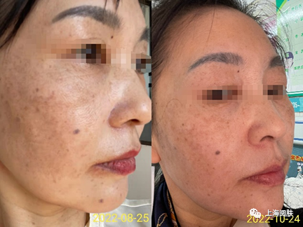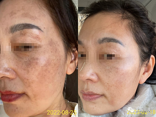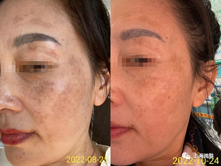 李女(nǚ)士,45歲,面部黃(huáng)褐斑,2022-08-25初診。根據黃(huáng)褐斑的(de)發病原因,予口服藥、外(wài)用(yòng)藥治療的(de)同時(shí),搭配閱膚的(de)煥膚精華素、皮膚屏障修護霜及物(wù)理(lǐ)BB防曬霜輔助。兩個(gè)月(yuè)後複診,面部黃(huáng)褐斑色沉變淡。